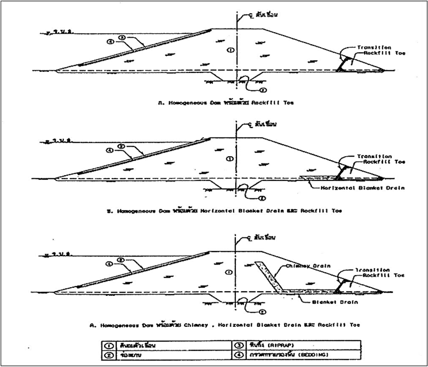-เขื่อนดินที่มี Rock fill Toe, Blanket Darin และ Chimney Drain เป็นระบบระบายน้ำภายในตัวเขื่อน